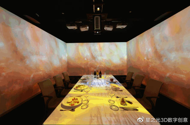 全息餐廳多個(gè)題材的場景切換,不需要太高的技術(shù)含量,可以用白色的墻壁投影,不用做太多的裝飾,也可以用圓桌、方桌、長桌等多種形式進(jìn)行投影。