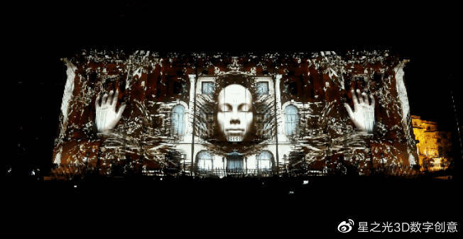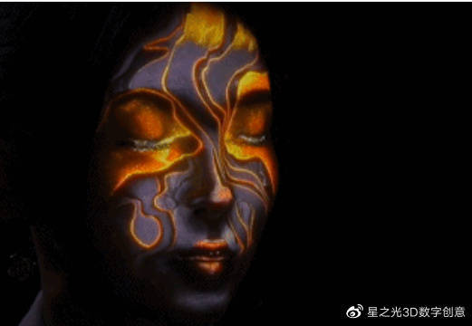 利用3D動畫技術,產(chǎn)生臉部藝術效果,再將其投影到人的臉部,從而構成“影像面具”,從海洋、海豚到面具碎片,都是非常精細的。